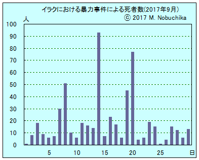 | 9.14 | 南部ディカール州ナーシリヤ近郊の検問所と飲食店での自動車爆弾による自爆攻撃と銃撃によりイラン人巡礼者7人含む84人死亡,93人負傷,ISが実行声明。(AP)(AFP) #アンバル州西部アナで空爆により民間人家族3人死亡,10人負傷。(IN) #バクバ北東ジャラウラでクルド治安部隊に接近した民間人への隊員の発砲により民間人1人死亡。(NINA) シーア派民兵組織バドル機構の事務総長がクルド自治区独立の住民投票が実施された場合には内戦がおこることは不可避であると警告。(IN) モスル西方カイラワンでシーア派民兵部隊がISの攻撃を撃退しIS自爆要員12人死亡。(IN)(NINA) |