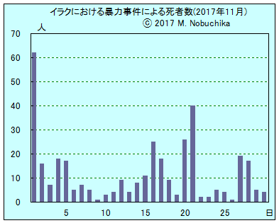 | 11.30 | バグダッド南方地域の検問所への武装集団の銃撃により治安部隊員1人死亡,2人負傷。(IN) バグダッド北郊タージでIED攻撃により3人負傷。(IN) バグダッド西郊アブグレイブでIED攻撃により民間人2人負傷。(IN) ティクリート東方トゥズクルマトとキルクーク南方ダクク間の地域でISとの戦闘によりトルクメン民兵3人死亡,10人負傷。(IN) モスル西部で武装集団の銃撃により石油会社職員1人死亡。(NINA) バクバ北東カラタッバ地域で治安部隊がISの攻撃を撃退。(NINA) キルクーク西方ハウィジャでIS残存勢力掃討作戦によりISメンバー6人死亡。(IN)(NINA) モスル南方地域でシーア派民兵部隊がISの攻撃を撃退しIS戦闘員4人死亡。(NINA) |