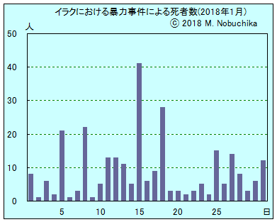 | 1.2 | 国連イラク派遣団(UNAMI)が2017年12月の暴力事件によるイラク民間人死者は69人,負傷者は142人,2017年の民間人死者は3,298人,負傷者は4,781人と発表。(UNAMI) キルクーク東部で武装集団の銃撃によりトルクメン戦線の治安部隊員1人死亡。(NINA) バグダッド北郊タージでIED攻撃により3人負傷。(IN) バグダッド北郊タルミヤでIED攻撃によりイラク兵2人負傷。(IN)(NINA) ラマディ北方地域でIED攻撃により警官1人負傷。(IN) モスル東部地域で治安部隊がIS戦闘員10人を逮捕。(IN)(NINA) アンバル州西部シリア国境地域で警官隊の作戦行動によりIS戦闘員15人死亡。(IN)(NINA) アンバル州西部シリア国境地域でシーア派民兵部隊がISの攻撃を撃退しIS戦闘員18人死亡。(IN)(NINA) |