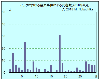 | 6.15 | バクバ北東ナフトカナ地域でISの攻撃によりシーア派民兵1人死亡,3人負傷。(NINA) キルクーク北方地域で武装集団と対テロ部隊の交戦により女性1人含む民間人4人死亡,対テロ部隊員3人負傷。(NINA) バスラ中心部で武装集団の銃撃により青年1人死亡。(NINA) ディヤラ州イマム・ウィー地域の検問所でシーア派民兵部隊の作戦行動によりISメンバー6人死亡。(IN)(NINA) バクバ南方の検問所へのISの攻撃を警官隊が阻止,警官1人負傷。(NINA) 北部の山岳地域でトルコ軍の空爆によりクルド労働者党戦闘員26人死亡,トルコ軍当局発表。(R) |