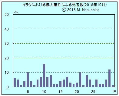 | 10.17 | サラハディン州北部シャルカットでIED攻撃により警官1人含む3人死亡。(IN) モスル南方カイヤラ地域でIED攻撃により水道局職員3人死亡。(NINA) バグダッドからキルクークへ向かう道路でISがバスを襲撃し子ども1人含む3人負傷。(IN) バクバ北東ナフトカナでIED攻撃によりシーア派民兵1人死亡。(NINA) バグダッド東部サバアコソール地域で手榴弾攻撃により民間人2人負傷。(IN) モスル北方20q地域で警官隊の作戦行動によりISメンバー4人逮捕。(NINA) |