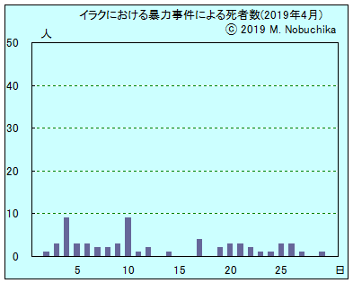 | 4.19 | キルクーク北西地域で治安部隊とISの戦闘によりIS戦闘員12人死亡,対テロ部隊員2人死亡,1人負傷。(NINA) バクバ北東アッバラ地域でIED攻撃により農夫とその息子計2人負傷。(NINA) バグダッド北東部シャアブ地区で武装集団の銃撃によりシーア派民兵部隊長1人負傷。(NINA) バクバ北東カナキンのクルド愛国党の事務所に手榴弾攻撃,死傷者なし。(NINA) バクバ北東カラタッバ地域の地方議会施設に2個の手榴弾攻撃,死傷者なし。(NINA) キルクーク西方ハウィジャ地域で治安部隊の作戦行動によりISメンバー12人死亡。(IN)(NINA) アンバル州西部ルトバで治安部隊がISメンバー12人を逮捕。(IN) |