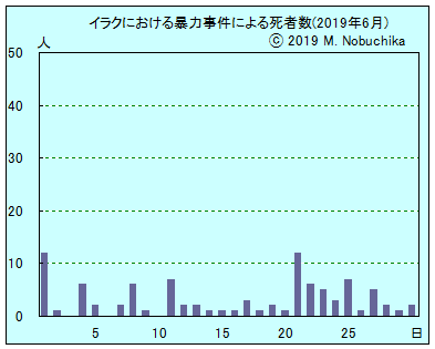 | 6.28 | キルクーク西部アッバシ地区でISの迫撃砲攻撃により民間人2人死亡,1人負傷。(NINA) バグダッド東部ウル地区で手榴弾攻撃により民間人2人負傷。(NINA) |