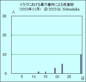 | 11.30 | バクバ北東ワジヒヤ地区のウムラニヤ村で国民議会議員の集会から帰る支持者たちへのIED攻撃により9人死亡,12人負傷。(NINA) バクバ北方アドハイム地区のイラク軍拠点へのISの攻撃によりイラク軍将校1人死亡。(NINA) バグダッドで銃撃により警官1人負傷,銃撃者は逮捕。(NINA) ティクリート東方トゥズクルマト地域でイラク軍の空爆によりISの隠れ家を破壊,中にいたメンバー多数死傷,統合作戦本部発表。(NINA) バグダッド西郊アブグレイブ地域で治安部隊がISの残した迫撃砲弾やミサイル,装備などを発見し処理。(NINA) キルクーク地域でシーア派民兵部隊がISの設置したIED2個を発見し爆破処理。(NINA) 北部地域でトルコ軍の作戦行動によりクルド労働者党(PKK)幹部1人死亡,トルコ国防省発表。(NINA) 米国防総省がイラクとシリアの米軍拠点への攻撃は10月17日以降で74回と発表。(NINA) |