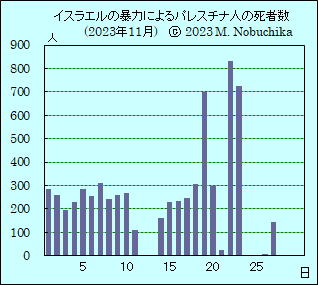 イスラエルのガザ地区攻撃による死者数は各日に配当して 発表されていないため,上記グラフは合計死者数が発表さ れた日に便宜的に配当して作成。 11月12日以降,パレスチナ保健省はガザ地区の死者数の 発表をしていない。イスラエル軍の攻撃の激化や通信手段の 切断によって集計と発表が困難になったと推測される。 したがって,上のパレスチナ人の死者数のグラフは,12日以降 についてはウェブ上の各種メディアの発表を集計したもの(14日)。 |
