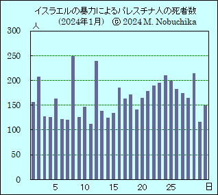 [パレスチナ情勢] パレスチナ保健省(PMH)が1月14日のイスラエル軍の攻撃によるパレスチナ人の死者は125人,負傷者は265人,2023年10月7日以降のイスラエル軍の攻撃によるガザ地区のパレスチナ人の累計死者数は23,968人,負傷者は60,582人と発表。(PMH) イスラエルのネタニヤフ首相がハマスとの戦闘開始から100日目にハマス掃討作戦は「誰にも止められない」と主張しハマス殲滅まで攻撃を継続すると言明,またハマス殲滅後もガザ地区に軍事装備や殺傷武器が流入するのを防ぐためにガザ地区とエジプトとの境界地帯を封鎖する必要があると主張。(R)(AFP)(CNN) レバノン南部からイスラエル北部への誘導ミサイル攻撃によりイスラエル民間人2人死亡,1人負傷,イスラエル軍がレバノンから侵入しようとした武装勢力4人を殺害したと発表。(R) レバノンのヒズボラ最高指導者ナスララ師が米軍によるイエメンのフーシ派への攻撃について,紅海が紛争地域と化し,同海域を航行するすべての船舶に被害が及ぶ状況を米国が作ったと批判。(R) |