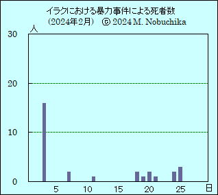 | 2.25 | バクバ北東ヒブヒブ地区で武装集団の銃撃によりディヤラ大学のスクールバスの運転手1人死亡。(NINA) メイサン州アマラで武装集団の銃撃により女性1人死亡。(NINA) モスル西部でISの残したIEDの爆発により民間人1人負傷。(NINA) サラハディン州で治安部隊がISの設置したIED12発を発見し爆破処理。(NINA) キルクーク地域でシーア派民兵部隊がISメンバー1人を逮捕。(NINA) 北部地域でトルコ軍の空爆によりクルド労働者党(PKK)戦闘員4人死亡,トルコ国防省発表。(NINA) |
