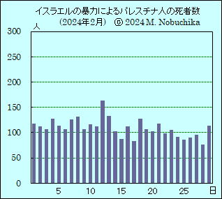 | 2.19 | バビル州アブ・ガルク地区の国際高速道路でサラヤ・アルサラム(平和部隊)の司令官の射殺体発見。(NINA) | 株価:前週末比16.86円安の38,470.38円。(2)(5) | [パレスチナ情勢] パレスチナ保健省(PMH)が過去24時間のガザ地区へのイスラエル軍の攻撃によるパレスチナ人の死者は107人,負傷者は145人,2023年10月7日以降のイスラエル軍の攻撃によるガザ地区のパレスチナ人の累計死者数は29,092人,負傷者は67,028人と発表。(PMH) ガザ地区中部ヌッセイラート難民キャンプ,ディル・アルバラ,ザワイダ地域へのイスラエル軍の空爆により女性と子ども中心にパレスチナ人70人死亡,アルジャジーラTV報道。(NINA) ヨルダン川西岸地区ナブルスとラマラをイスラエル軍が急襲。(NINA) イスラエル軍が昨年2023年10月7日以降のガザ地区でのイスラエル兵の死者が574人,負傷者は2,938人と発表。(NINA) イエメンのフーシ派がアデン湾を航行中のレバノン企業運航の米国の貨物船とギリシャ船籍で米企業保有の貨物船をミサイルで攻撃したと発表,船体に損傷,死傷者なし。(R)(NINA) 米国が安保理にガザ地区南部ラファでのイスラエル軍の地上攻撃に反対する決議案を提出。(AP)(R)(CNN) |