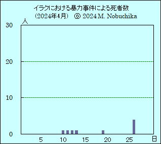 | 4.26 | 北部クルド自治区のコール・モール天然ガス田で無人機の攻撃により作業員4人死亡,2人負傷。(R)(NINA) サラハディン州アル・ドゥール地区でシーア派民兵部隊が非合法のバアス党メンバー4人を逮捕。(NINA) |