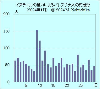 [パレスチナ情勢] パレスチナ保健省(PMH)が過去24時間のガザ地区へのイスラエル軍の攻撃によるパレスチナ人の死者は68人,負傷者は94人,2023年10月7日以降のイスラエル軍の攻撃によるガザ地区のパレスチナ人の累計死者数は33,797人,負傷者は76,465人と発表。(PMH) ヨルダン川西岸地区北部ナブルス近郊のパレスチナ人居住地域をイスラエル軍部隊監視下で武装したユダヤ人入植者が襲撃しパレスチナ人青年2人死亡,地区首長発表,イスラエル兵が負傷者を搬送しようとした救急車をブロック,赤新月社発表,同地区ナブルスでイスラエル兵の発砲によりパレスチナ人青年1人死亡,3人負傷,警察はパレスチナ人が爆発物を投げようとしたための自衛措置と説明。(R) ガザ地区北部でイスラエル軍の発砲によりパレスチナ人避難民5人死亡。(AP) イスラエルの戦時内閣kが前日のイランによる攻撃への対応を協議,報復の時期や規模で一致せず結論を先送り,ガンツ前国防相は「しかるべき時に代償を強いる」と発言,バイデン政権はイランへの攻撃に参加しないと言明しネタニヤフ首相に「慎重な対応」を要求。(AP)(R)(BBC)(CNN) カリフォルニア州ゴールデンゲート・ブリッジでガザ地区への連帯を訴える抗議行動,デモ参加者数百人が同橋を封鎖,イリノイ州のシカゴ・オヘア空港周辺でもデモ参加者が道路を占拠。(3) |