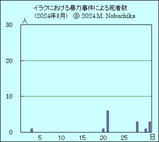| 8.20 | バクバ北東アッバラ地区で武装集団の銃撃により民家人1人死亡。(NINA) モスルでシーア派民兵部隊が作戦行動によりISの「死の部隊」メンバー1人死亡。(NINA) 北部地域でトルコ軍の作戦行動によりクルド労働者党(PKK)の女性幹部1人死亡,トルコ情報機関発表。(NINA) |