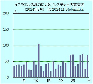 [パレスチナ情勢] パレスチナ保健省(PMH)が過去24時間のガザ地区へのイスラエル軍の攻撃によるパレスチナ人の死者は33人,負傷者は118人,2023年10月7日以降のイスラエル軍の攻撃によるガザ地区のパレスチナ人の累計死者数は39,583人,負傷者は91,398人と発表。(PMH) ガザ地区北部ガザ市の避難所の学校へのイスラエル軍の空爆により子ども含むパレスチナ人少なくとも30人死亡,多数負傷,同市ジャバリア難民キャンプへのイスラエル軍の空爆によりパレスチナ人11人死亡,中部ディル・アルバラのアルアクサ病院内の避難民テントへのイスラエル軍の空爆によりパレスチナ人5人死亡,18人負傷,同地域の住宅へのミサイル攻撃によりパレスチナ人3人死亡,医療当局発表。(R) イスラエル西部テルアビブ近郊ホロンでパレスチナ人のナイフによる襲撃によりイスラエル人2人死亡,2人負傷,警官の発砲により襲撃者1人死亡,ハマスはイスラエルによるパレスチナ人への攻撃とハニヤ最高指導者の暗殺に対する「当然の反応」とコメント。(R)(3) イエメンのフーシ派がアデン湾を航行中のリベリア船籍のコンテナ船をミサイルで攻撃したと発表,コンテナ船は喫水線の上部に軽い損傷のみ。(AP) |