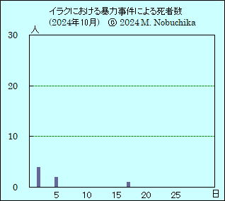 | 10.17 | イラクの「イスラム抵抗運動」がパレスチナとレバノンの人々の支援のためにイスラエル南部紅海沿岸のエイラートを無人機で攻撃したと発表。(NINA) ディヤラ州カナアン地区で警官1人の射殺体発見。(NINA) キルクーク北部地域でイラク軍の空爆によりISメンバー4人死亡。(NINA) アンバル州西部ラワでイラク軍諜報部隊がISメンバー1人を逮捕。(NINA) |