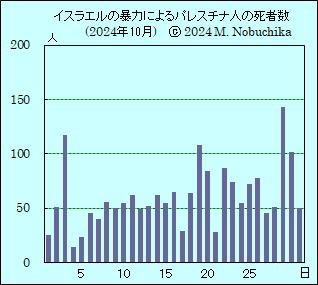 | 10.27 | イラクの「イスラム抵抗運動」がパレスチナとレバノンの人々の支援のためにイスラエルが占領するゴラン高原のイスラエル軍拠点を無人機で攻撃したと発表。(NINA) | 衆議院議員選挙(定員465議席)の投開票,議席数は与党側:自民191(選挙前256),公明24(32),無所属6(7)で過半数割れ,野党側:立民148(98),維新38(43),国民28(7),れいわ9(3),共産8(10),参政3(1),社民1(1)。(2)(3) | 大統領選のトランプ共和党候補がニューヨークのマディソン・スクエア・ガーデンで支援者集会を開催,登壇したコメディアンのヒンチクリフ氏が「海のど真ん中に文字通り浮かぶゴミの島がある。プエルトリコって言うんだと思う」と発言,ニューヨークの元市長のジュリアーニ氏はハリス副大統領はガザ地区での戦争で「テロリストの味方をしている」と主張,トランプ陣営のミラー顧問はアメリカ人の仕事が「略奪され盗まれ」外国に送られていると主張,集会後にトランプ陣営の広報担当者はヒンチクリフ氏の発言はトランプ候補や陣営の「見方を反映するものではない」との声明を発表。(AP)(R)(BBC)(CNN) | [パレスチナ情勢] ガザ保健省(GMH)による過去24時間のガザ地区へのイスラエル軍の攻撃によるパレスチナ人の死傷者数の発表なし。(GMH) ガザ地区各地へのイスラエル軍の攻撃によりパレスチナ人少なくとも45人死亡,北部ジャバリア難民キャンプで空爆により少なくとも20人死亡,北部ガザ市シャティ難民キャンプで9人死亡,20人負傷,医療関係者発表。(R) イスラエル西部テルアビブ近郊のバス停にトラックが突っ込み1人死亡,約40人負傷,民間人の発砲により襲撃者のイスラエル在住のアラブ人1人死亡,イスラエル警察発表。(R) エジプトのシシ大統領がガザ地区での2日間の停戦とハマスが拘束中のイスラエル人人質4人とイスラエルが拘束中のパレスチナ人数人との交換を提案。(R) レバノン保健省がイスラエル軍の攻撃開始以降の累計死者数は2,672人,負傷者は12,468人と発表。(NINA) |