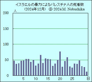 | 12.8 | アンバル州のシーア派民兵部隊司令官がシリアの反体制派がアサド政権を打倒したことを受けて,イラク軍とシーア派民兵部隊,国境警備隊がシリアとの国境の警備を最高度に強化したと発表。(NINA) | トランプ次期大統領がNBCテレビのインタビューで,米国に不法滞在するすべての移民を強制送還することをめざす一方,幼少期に親に連れられて米国に不法入国した「ドリーマー」と呼ばれる若者を保護する措置を望んでいると述べ,不法移民の親を持ち米国で生まれた子どもに市民権を自動的に付与する制度を廃止する大統領令を就任初日に発動する計画を発表。(R) | [パレスチナ情勢] ガザ保健省(GMH)が過去24時間のガザ地区へのイスラエル軍の攻撃によるパレスチナ人の死者は44人,負傷者は74人,2023年10月7日以降のイスラエル軍の攻撃によるガザ地区のパレスチナ人の累計死者数は44,708人,負傷者は106,050人と発表。(GMH) ガザ地区各地へのイスラエル軍の攻撃により少なくとも子ども8人含むパレスチナ人14人死亡,保健当局発表,中部ブレイジ難民キャンプで空爆により子ども6人含む9人死亡,アル・アクサ病院発表,中部ヌッセイラート難民キャンプで避難テントへの空爆により少なくとも子ども2人含む5人死亡,北部ガザ市のインドネシア病院への攻撃により患者6人負傷,保健省発表。(AP)(R) [シリア情勢] 反体制派が政府軍の抵抗をほどんど受けずにダマスカスに到達し「ダマスカスは解放され,暴君バッシャール・アル・アサドは倒された」と宣言,アサド大統領とその家族は航空機でロシアに逃亡しロシア政府は人道的見地から同国への亡命を承認。(AP)(R)(BBC) <解説> *北西部アレッポで11月27日に開始されたアサド政権に対する攻勢を主導したのはイスラム武装組織「ハイヤット・タハリール・アルシャーム(HTS)」で,HTSの前身は2012年12月に結成したとされる「アル・ヌスラ戦線」で,2013年4月に「イラクとレバントのイスラム国(ISIL)」のバグダディ指導者はヌスラ戦線を「ISILシリア支部」と発表,戦線はこれを否定しアルカイダのザワヒリ最高指導者に忠誠を誓ったと宣言,その後に戦線メンバーの一部はISILシリア支部として活動,ヌスラ戦線は2016年にアルカイダと決別しHTSを名乗るようになった。(BBC,ウィキペディア,対テロ戦争年表などから作成) |