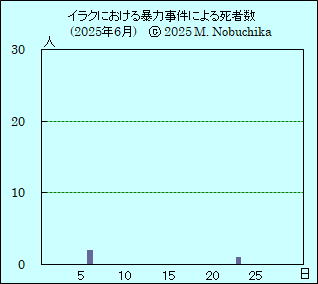 | 6.23 | バグダッド北郊タージのイラク軍基地を国籍不明の無人機が攻撃,死傷者なし,バグダッド作戦本部発表。(NINA) バクバ北東ミクダディヤで武装集団の銃撃により政府契約業者1人死亡。(NINA) モスル地域でシーア派民兵部隊がイラク軍部隊と合同でIS残存勢力追跡作戦を実施。(NINA) |