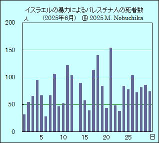 | 6.19 | 株価:前日比396.81円安の38,488.34円。(2)(5) | [パレスチナ情勢] ガザ保健省(GMH)が過去24時間のガザ地区へのイスラエル軍の侵攻の結果としてのパレスチナ人の死者は69人(うち2人は瓦礫の下などから発見),負傷者は221人,2023年10月7日以降のイスラエル軍の攻撃によるガザ地区のパレスチナ人の累計死者数は55,706人,負傷者は130,101人と発表。(GMH) ガザ地区各地へのイスラエル軍の攻撃によりパレスチナ人少なくとも84人死亡,病院当局発表,北部ガザ市のシャティ難民キャンプで空爆により女性と子ども含む少なくとも19人死亡,北部ジャバリア難民キャンプで空爆により少なくとも14人死亡,中部の「ガザ人道財団(GHF)」の物資配給所付近で食料を受け取りに来た住民へのイスラエル兵の発砲により少なくとも12人死亡。(R)(NINA) [イラン・イスラエル情勢] イスラエル南部ベエルシェバのソロカ病院にイランから発射された弾道ミサイルが直撃し施設の一部が損壊,イランの革命防衛隊は病院近くのイスラエルの軍事・情報本部標的の攻撃と説明,イスラエル軍はイラン西部のアラク原子炉とナタンズの核兵器開発拠点を攻撃したと発表,イラン原子力庁は核施設への攻撃は「国際法違反」と非難,テルアビブへの攻撃により47人負傷。(R)(AFP) イスラエルのネタニヤフ首相がイランのすべての核関連施設を攻撃すると発表,ハメネイ最高指導者も攻撃対象から排除しないと警告。(CNN) |